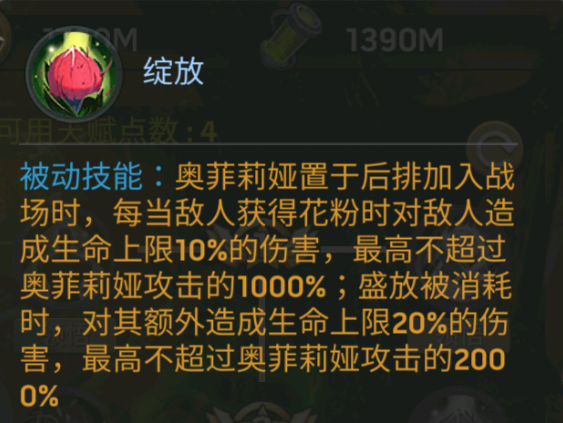 《末日血战》奥菲莉娅英雄信息(技能和天赋详细解说) 1技能大招:1500%伤害数值,在没有多段高额被动伤害的加持,面对现在新英雄高减英雄属性最终造成伤害量只能说一般,所以伤害量就别抱有期望了,本期的英雄输出方面不具备爆发性质,1技能主要是为目标附加花粉buff,花粉buff最大的亮点就是降低速度和能量,但触发的前提也是至少需要叠加3层才能发挥核心清能量,叠加4层才能发挥禁止敌方释放大招无法行动 游戏资讯 2024年03月07日 1 点赞 0 评论 854 浏览