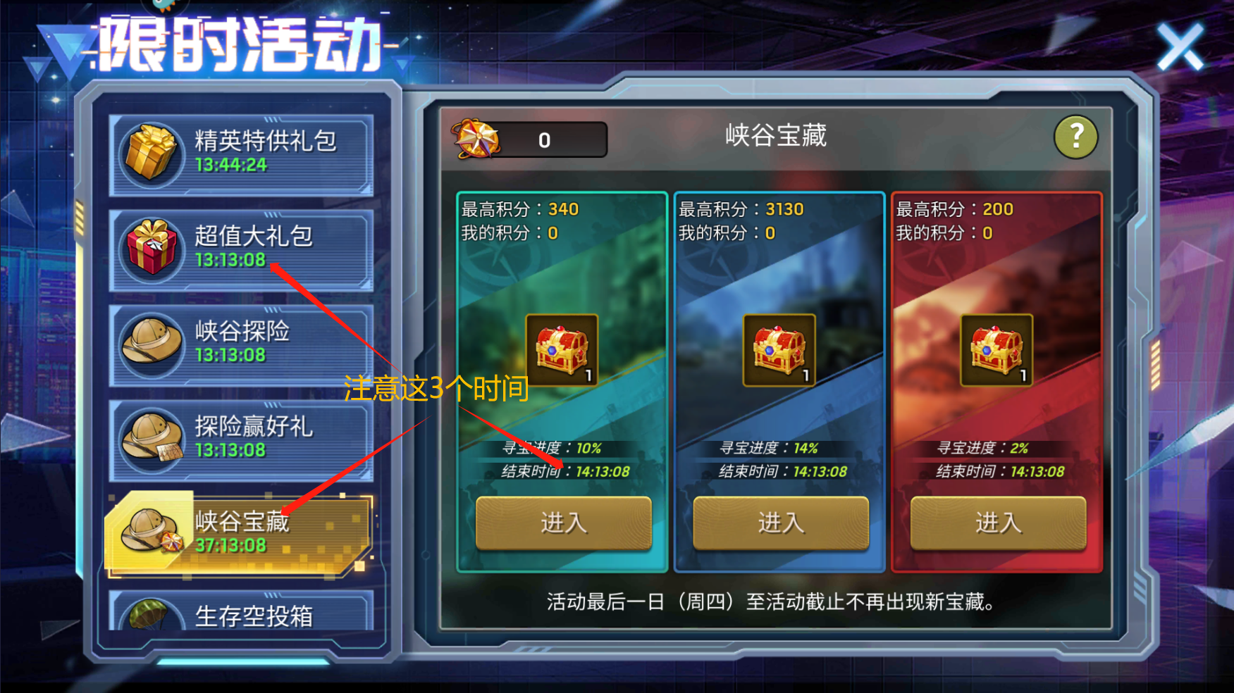 《末日血战》 藏宝图峡谷宝藏(为什么不要上哪吒和克里斯蒂娜) 左上角超值大礼包时间:今晚24点之前不买,后面就买不到。左下角峡谷宝藏倒计时:展示倒计时,会展示到周五的24点。右下角时间:砸指南针的倒计时。周五凌晨1点截止! 游戏资讯 2023年11月11日 9 点赞 0 评论 458 浏览