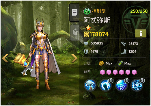 阿忒弥斯以女武神为原型,还拥有媲美雷神的雷电技能,总之一个字,帅!阿忒弥斯拥有3个被动技能和1个终极技能,终极技能对随机一名敌人造成300%伤害,80%的几率眩晕2回合,对其他所有目标造成150%溅射伤害,30%几率眩晕2回合,从技能描述就能看出阿忒弥斯的强大,爆炸伤害和高几率的范围眩晕,溅射伤害还有30%几率眩晕其他敌人,当之无愧的眩晕王。被动增加30速度,25%生命和20%暴击,免疫眩晕,生命低于80%时增加30%减伤和30%暴击(持续5回合,只触发一次),免疫眩晕增加免伤的特性被动也能将阿忒弥斯放在前排吸收伤害。友方释放技能30%几率随机眩晕一名敌人(2回合),敌方释放技能对随机一名敌人造成200%伤害。“女雷神”阿忒弥斯真正地将眩晕演绎到了极致,虽然收集难度高,但是想要拥有控制型英雄,阿忒弥斯是不二选择。