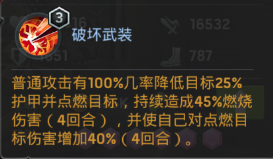 莉兹品阶2之后解锁技能破坏武装,使得其普通攻击有100%概率降低目标25%的护甲并点燃目标,造成45%的燃烧伤害4回合,并使得自己对引燃目标伤害增加40%。该燃烧效果可与一技能的燃烧相叠加,等于对方身上会吃到连续两个不同的燃烧buff,而莉兹针对燃烧目标的伤害加成的判定条件为,只需要对方处于燃烧状态即可,也就是说队伍中有其它点燃类型的英雄也可以为莉兹提供这一效果收益。