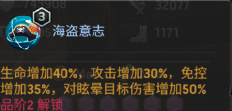 卡特琳娜的二技能海盗意志,增加自身40%的生命,30%的攻击,35%的免控率以及获得一个队眩晕目标增加50%伤害的特性。除去最后一个特性外,其余部分都是直接作用在卡特琳娜的初始面板上的。由于卡特琳娜在突破2阶的时候,自身还未可以对敌方造成眩晕,所以前期的时候卡特琳娜的输出将会十分依赖队友。