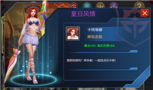 说回正经的,从面板上来看,卡特琳娜的血量很高,同类型英雄中仅次于凛冬。卡特琳娜满阶突破之后的面板会额外多出35%的免控率,在搭配上适当的装备之后并不惧怕被控制型英雄针对。卡特琳娜是初始五星的英雄,可以通过高级招募或黑水晶碎片置换取得,现在刚好展开夏日活动,玩家可以同时取得卡特琳娜的皮肤与英雄本体。