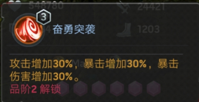 希娅玛的二技能奋勇突袭,其作用为直接曾加自身面板上限。希娅玛品级2解锁该特性之后,自身暴击伤害、攻击力、暴击率会同时上升30%,提升了自身的攻击能力。该效果直接影响人物面板,所以我们在看到满阶希娅玛的面板时,通常都是已经加上了这一数值之后得到的数字。