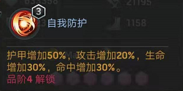 被动技能3:自我防护:护甲增加50%,攻击增加20%,生命增加30%,命中增加30%,与旧版相同。