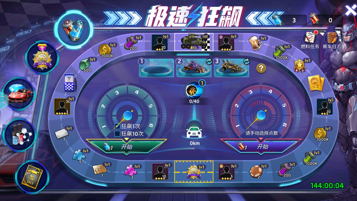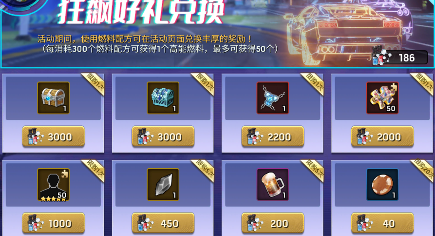 也可以2个648车神典藏礼包,加4-5个狂飙好运礼包,加签到的燃料配方,氪金约1500左右,换购光暗自选宝箱各一个!