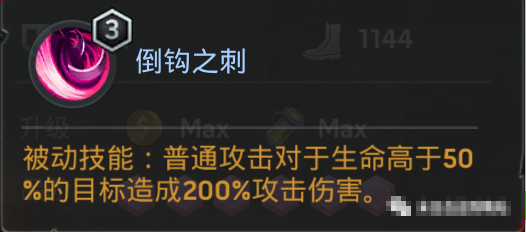 被动解读:咱们打boss的时候。大部分时候血量是高于50%的,因此这个被动很容易触发,也就大大提高了毒蝎的普攻伤害。之前是105%的伤害,加上200%也就是305%的伤害,大招才155%的伤害,差不多是大招伤害的两倍了。