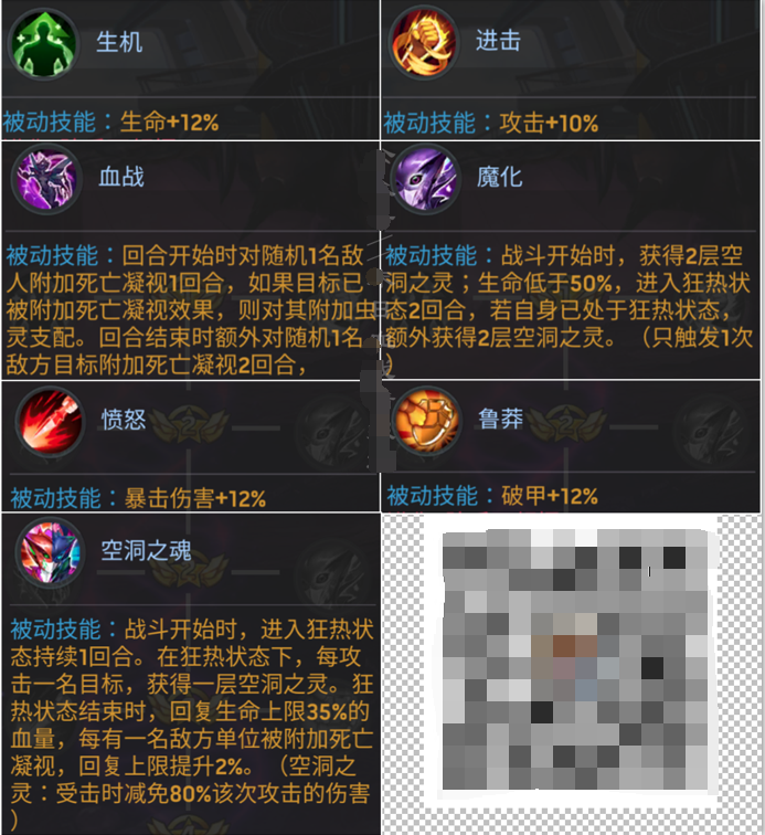 简述:回合结束后,对敌方血量最低的英雄降低护甲、减伤、持续伤害减免、闪避,并造成减疗的减益效果。