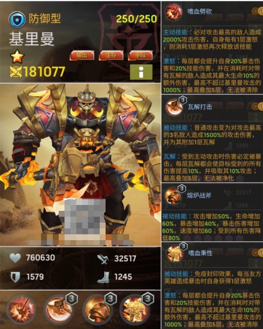 | 注意点:队友造成暴击时会为基里曼附加1层激怒,基里曼在释放大招后队友进行追击普攻时也会为基里曼叠加激怒(例如基里曼当前只有3层激怒开始放大招,实际只会释放4次大招,但如果配合狗头或那摩天的追击,在追击过程中也可以增加激怒层数,那么最终基里曼还是会释放满6个大招) |