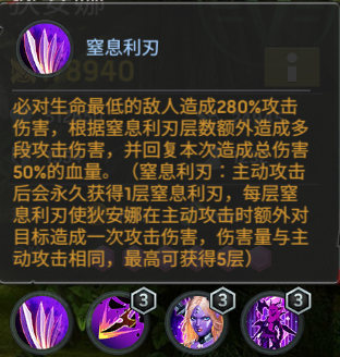 一技能:窒息利刃,新英雄的主要输出技能,大招仅攻击一名血量最低英雄,并且附带回血能力,窒息利刃为永久叠加技能,最高5层,叠满后主攻攻击为6倍伤害