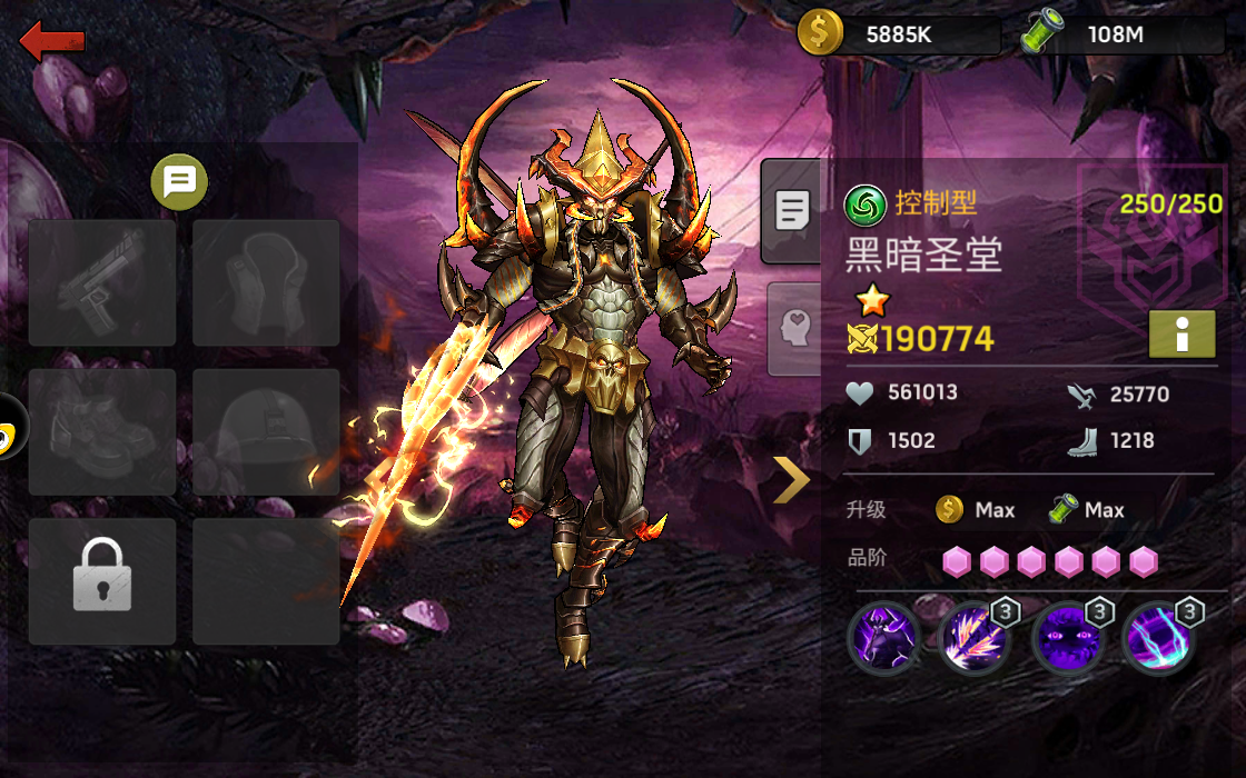 接下来是阵容,开局如果想玩一刀流的话,这边推荐阵容为黑暗圣堂、迪亚和阿尔法。一刀流的优点是推图快,PK也还行,特别是黑暗圣堂直到PVP后期都能一直用下去。至少在这两个版本的高端局中,我们依旧可以见到圣堂的身影,足以见到他的价值了。当然圣堂也有自己的问题,碍于阵营原因,圣堂培养起来会十分困难,所以如果开局就有,那先练到100级就可以放着了。后续突破十星,我估计都得是六个月之后的事情了。