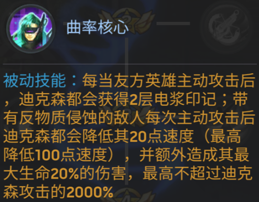 | 注意点:友方英雄主动攻击就能给迪克森附加2层电浆印记(进一步降速的前提是敌方被附加上反物质侵蚀,14星的核心前提就是反物质侵蚀,如果没有反物质侵蚀14星天赋几乎就是一个摆设,目前电浆印记的伤害非常低可以忽略不计) |