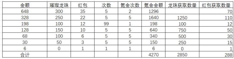 氪金4270可获取2850龙珠,黑水六轮加通行证可获取503红包,合计5030龙珠。