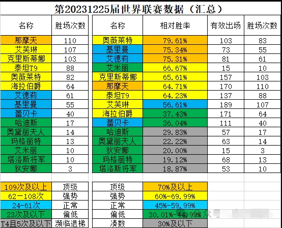 大家好,最新的世界赛再次落下帷幕。新一期的英雄T度有哪些变化?玩家做英雄哪些可以参考?这个已进月度的四系英雄,怎么就晋升T0呢? 第20231225届世界联赛数据跟进(汇总) 双平台数据(IOS末日血战、9665血色警戒) 共计有效对局131场次! 本期英雄T度的数据来源:亦存儿 针对每个出场的英雄,或者多个相同英雄,主要包括有效出场、胜场次数、相对胜率这三大维度,统计出来最新的英雄T度。 本期最新T度如下: 毫不例外都是当前最流行的主流光暗英雄。 奥薇莱特上线后成为最强辅助,但零回血、低输出让奥薇莱特没能取代曾经的第一支援艾芙琳。 从全方位支援角度看,艾芙琳仍然是最强奶妈。 那摩天已经普及,最高的甚至做了7+。 但是。 从目前的情况来看,那摩天将于月底入驻月度商店。 到时候新光系也将上线。 那摩天很可能会迎来一波史诗级削弱。 目前建议保持现有数量,进月度后最多把还没做满的补满,不太建议再做更多的那摩天(具体根据新出的光系刺客能否取代甚至淘汰那摩天而定)。 (左边这个阵容,我特么......太任性了) 艾芙琳、克里斯蒂娜则即将步入黄昏。 只是当前保有率高、登场频繁,量变引起质变。 胜率直接代表该英雄的PVP能力! 如果说胜场意味着英雄的普及度,胜率则直接代表英雄在PVP领域的统治力! 这种情况下。 奥薇莱特胜率第一,显示出奥薇莱特末日第一辅助的神级地位。 胜率第二第三竟然都是四系,这就有点意思了! 特别是艾德莉,目前是已经进月度的四系。 苟策划果然是懂英雄的,当初为什么要把四系英雄艾德莉削弱,原来是这个原因。 奥薇莱特+艾德莉的减伤效果实在太猛。 可惜砍得太明显,被玩家投诉太厉害,又改回来,成就了目前的艾德莉T0地位! 艾德莉与奥薇莱特相得益彰。 图中右边这个阵容目前已是顶级阵容之一,毋庸置疑。 艾德莉只要不被对位,在这个阵容里可谓滴水不漏。 相比之下,基里曼目前的发挥其实不太稳定。 越是大佬,发挥越好。 越是平民,发挥越不稳定。 提示: 因此不要完全迷信胜率,普通玩家特别是新区玩家强行做艾德莉还是有风险的。 基里曼从目前看,反倒是万金油,至少一个是不亏的。 新区首选基里曼,也不会亏。 结合胜场、胜率统计的结果, 最新梯度: T0 奥薇莱特 艾德莉 那摩天 克里斯蒂娜 艾德莉升T0 泰坦T9掉T0.5 基里曼升T0.5 海拉伯爵掉T1 艾米丽升T2 海拉伯爵在大佬手中,已经进入了上不了场的尴尬境地。 克里斯蒂娜在高端局PVP中逐渐失去主导位置。 泰坦T9感觉本期发挥不是太好,正常来说,泰坦T9和克里斯蒂娜互换T度位置才对。 奥薇莱特的队友免疫封印盘活了绝大多数此前面临淘汰的英雄,比如泰坦、艾德莉,同时也将克里斯蒂娜送上了绞刑台。 除艾德莉和克里斯蒂娜之外,以上英雄是绝大多数玩家都可以投入资源培养的英雄。 但普通玩家培养也应当有所倾向: 那摩天,全能,首选。 奥薇莱特、泰坦T9,更倾向PVP,资源有余力才考虑。 当前版本四系之王基里曼在奥薇莱特登场后,升到T1,紧接着光刺即将登场,基里曼最多也就是T0.5了。 不过基里曼打BOSS也很好用,可以作为首选培养英雄。 近一年的四系英雄,最近排名靠前的四系英雄越来越多了。 看来苟策划也不希望末日血战变成光暗血战。 这才是正常应该有的格局——光暗主导,四系锦上添花。 但是小编还是建议玩家做光暗英雄,原因很简单: 做了奥薇莱特,没做基里曼的,会被两个英雄都做了的氪佬揍。 做了基里曼,没做奥薇莱特的,会被做了奥薇莱特的零氪玩家揍。 光暗英雄和四系英雄的地位就这么形象。 从2022年第一个暗系卡斯兰,历经玛格丽特、塔洛斯将军、艾芙琳、海拉伯爵、泰坦T9、克里斯蒂娜、那摩天、奥薇莱特一共9个光暗英雄。 目前为止,除了卡斯兰(暗法事件影响)、塔洛斯将军稍微弱一些,其他的光暗全部都是强势超过1年时间。 做光暗还是四系,兄弟们应该也有答案了! 注意事项: 本期英雄T度是通过世界赛实战数据进而分析得出的结论。 世界赛、巅峰赛都是顶端玩家的队伍配置,基本都是重度氪金玩家,英雄培养可参考不可完全模仿! 为了给普通玩家培养英雄提供参考,小编给出普通玩家培养英雄T度建议: T0:那摩天/海拉伯爵/基里曼 T1.5及以后的英雄不建议作为主力培养。 后续四系新英雄培养可参考以上的英雄定位培养。 问题来了:普通玩家怎么培养光暗英雄? 一个字:憋! 憋不住,不太建议玩末日。