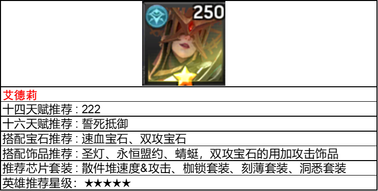 1、地狱领主的12星右边天赋,半血碰瓷流。升级到12星就能用,开局献祭,敌方有结算伤害英雄,开局直接半血或者死亡,触发眩晕石化,直接给敌方附加2层审判之眼,特别是孙悟空,达到降攻击效果,秒杀不了你的英雄,就能反手秒掉敌方。加上艾德莉本身的一层审判之眼,最高可附加到3层。