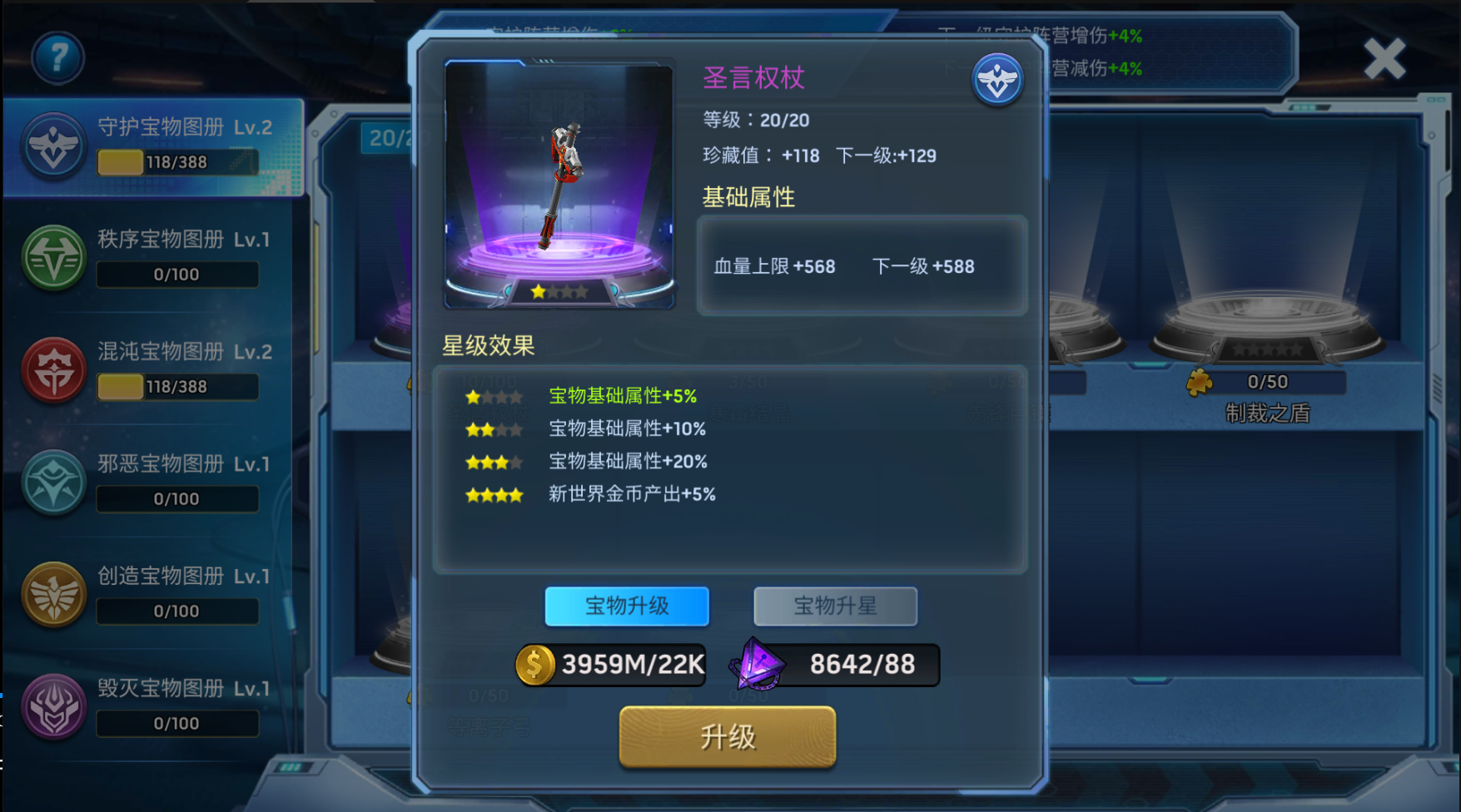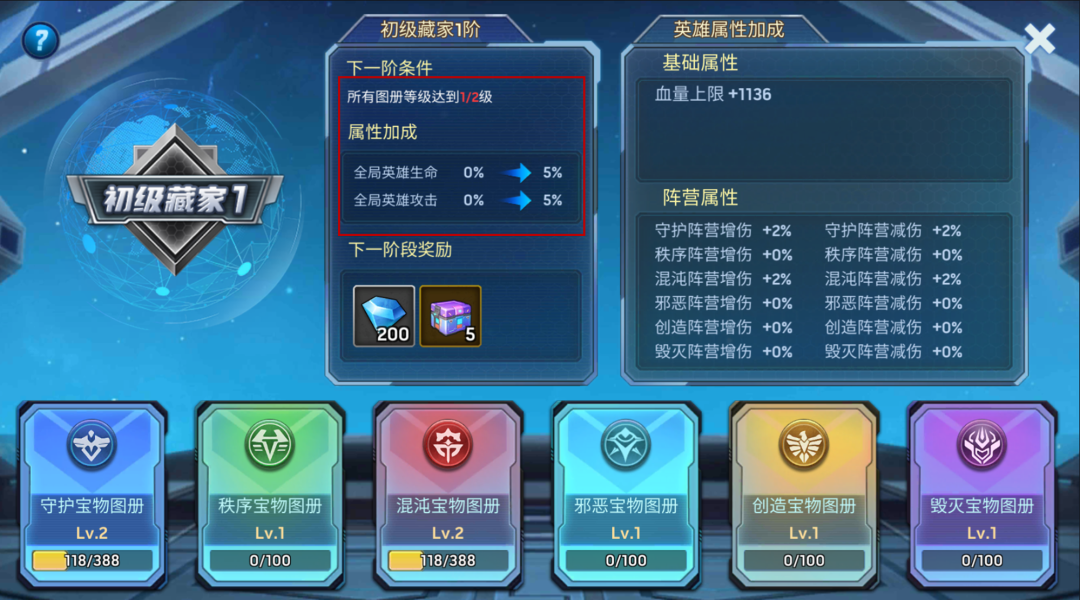 4.宝物陈列仓(属性提升):佩戴抽奖获得的专属阵营武器后,可以让专属阵营的全部英雄都能享受武器附带的属性增益(除了武器附带的专属增益外,图册升级后还能额外提升全局英雄的生命以及攻击的百分比增幅)