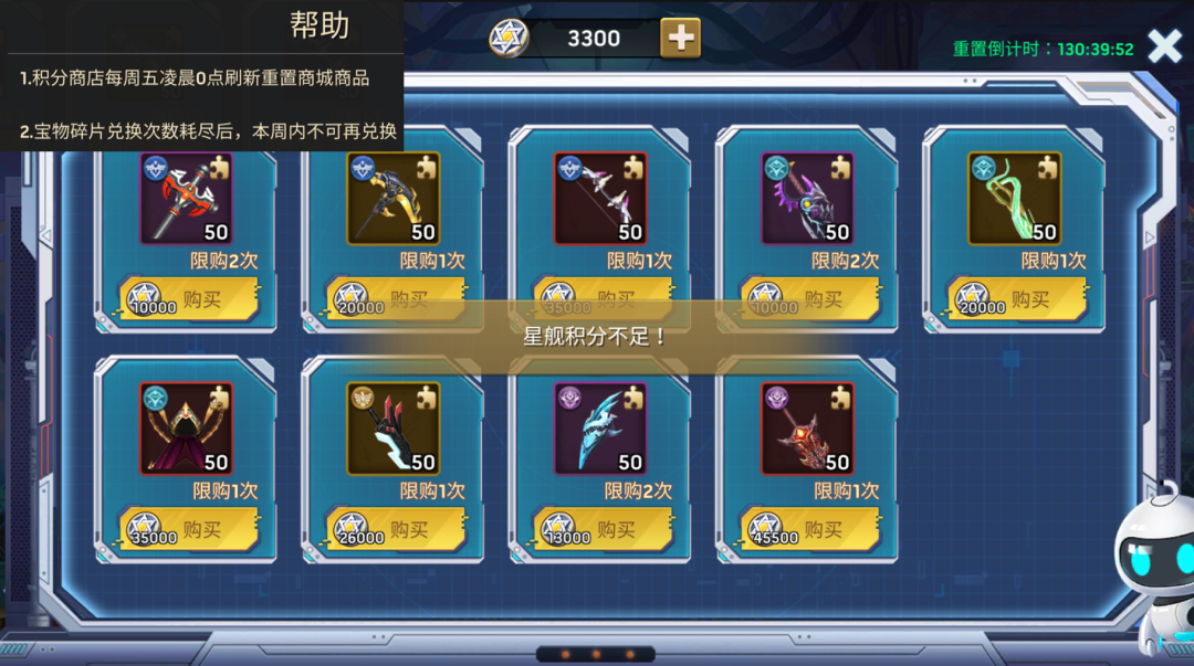 2.积分商店(兑换武器):星舰积分获取途径为消耗宝箱抽奖时会额外赠送,每消耗一个随机宝箱可以获得100星舰积分,攒到足够积分时可以直接兑换需要的武器(每周五0点,会刷新商城更新武器种类)