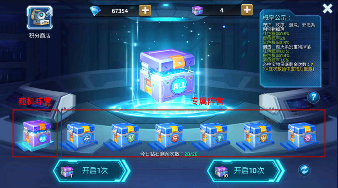 1.宝物开箱(抽奖):抽奖分为随机阵营和指定专属阵营抽取,随机阵营宝箱可以通过白嫖获得,专属阵营的宝箱必须要氪金才能获得