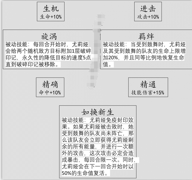 14星天赋:尤利娅获得免疫封印的效果,目前版本中免疫封印大多在3技能就会被赋予,这里显得CH有点抠搜了。除了免疫封印外主要是尤利娅死亡后,会转移全部能量给队友以及队友可额外获得一次攻击(这里额外攻击目测是一次普攻,如果满足100点能量能额外释放大招,那么此英雄的梯度将直接晋升到T0,但概率几乎是微乎其微,具体等待上新后便知),14天还赋予尤利娅被鼓舞的友方英雄只要不死亡,尤利娅在下回合开始时会获得复活,这也意味着尤利娅可以玩献祭流配合被保护的英雄每回合多一次额外出手的机会