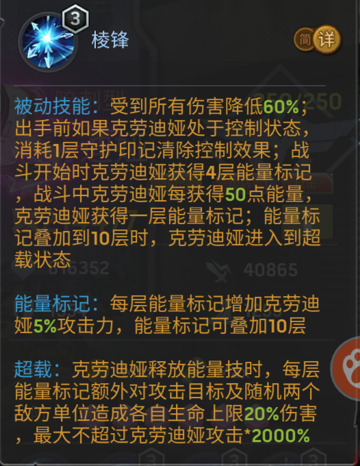 全减伤降低60%,并不算高,能够消耗守护印记解控,说实话,不咋地,没有免疫封印以及重置就是菜鸡!战斗开始就能获得4层能量标记,50能量=1层标记。10层以后进入变身,超载状态。