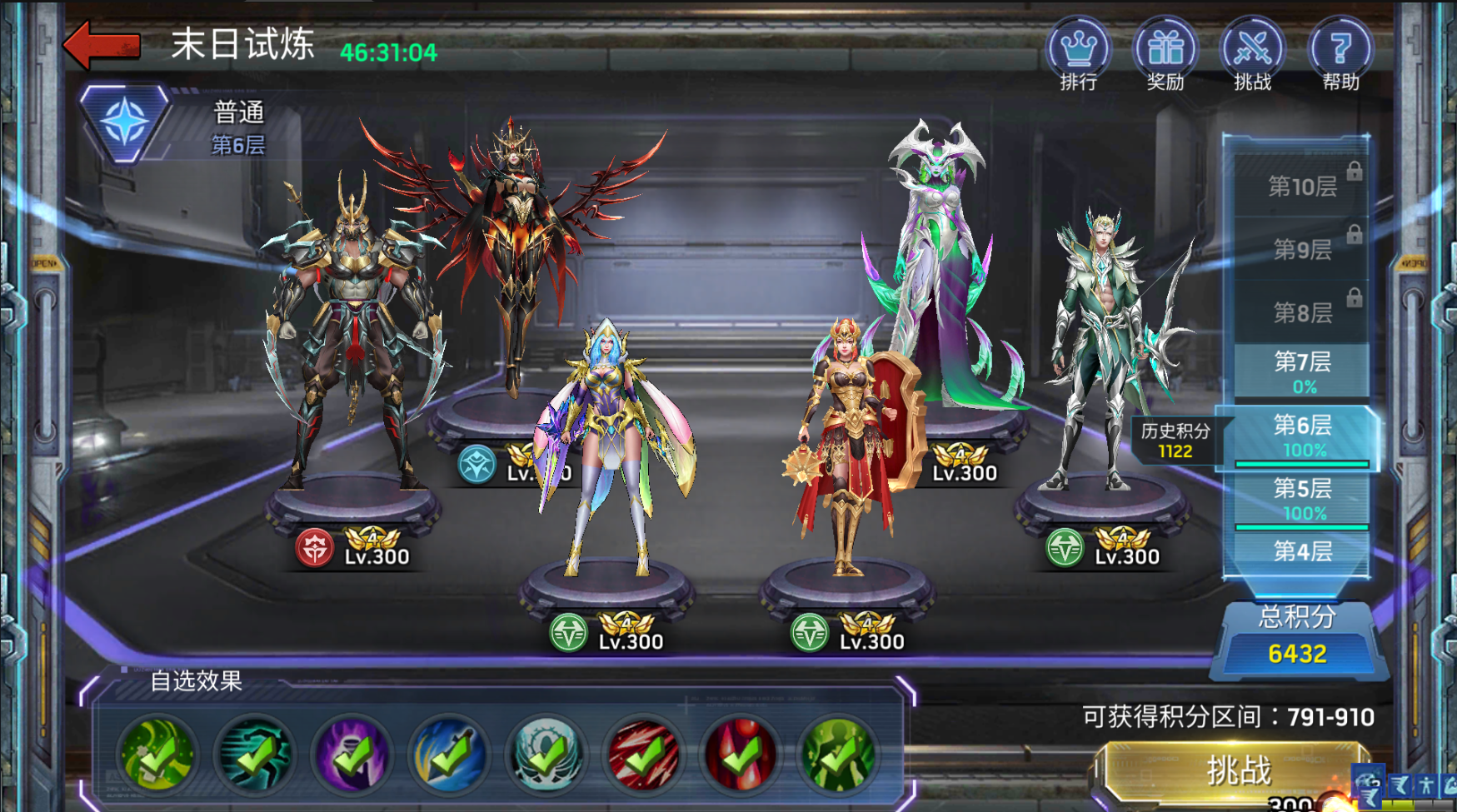 第十关:蒂+尤利娅+那摩天+奥薇莱特+那摩天+基里曼+不选复活buff+不选圣灯+不选救赎(多回合结束战斗,1032分),只有单那摩天打的时间将会更久