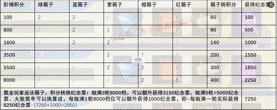活动流程:使用箱子→获得积分→阶梯积分解锁→获得纪念票→天梯兑换换购↓↓↓