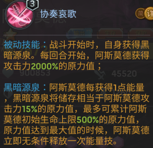日常攻略 --------------------------------- 一技能(注意项) 1、必中技打全部,造成自身15倍伤害(此伤害会受到敌方减伤率和全伤害减免影响),20%最大生命伤害受全伤害减免和阿卡莎护盾影响 2、原力值造成的溅射伤害跟自身伤害+获取能量速度+生命值上限挂钩(不穿衣服生命值越少,获取叠满能量额外出手的条件也就更容易达成,但此方案仅限旁边有菲尼克斯进行相辅相成,没有菲尼克斯或魔窟作战时玩少血就是想死的快) 3、满原力值时可额外释放一次大招,释放次数没有上限,但sp克尔伯鲁变墓碑会限制出手 二技能(注意项) 1、必中技打随机3人,造成自身15倍伤害(此伤害会受到敌方减伤率和全伤害减免影响),20%最大生命伤害受全伤害减免和阿卡莎护盾影响 2、生命高50%造成额外伤害,生命低50%偷取能量,普攻时额外获得12被攻击原力值(没什么特别之处,主要是普攻增加原力值的获取速度) 三技能(注意项) 1、标配技能没什么特别之处,3技能亮点主要是配置了重置机制(重置=消除头顶的红色负面buff,以及解除部分控制技能) 四技能(注意项) 1、每回合按自身攻击值20倍攻击额外获取原力值,所以想快速获取多的原力值需要去堆攻击面板属性 2、黑暗源泉这里跟1技能一样,没什么特别之处 天赋技能(解析) 12星左天赋(注意项) 1、有单位死亡就能继承目标的10%速度和20%攻击(尤利娅的不断复活这里也可持续叠加属性) 2、死亡后又复活,增加的属性会消失 12星右天赋(注意项) 1、50%概率禁令或封印,拥有半血复活的能力,这里的复活是必复活不会因为队友死完而结束战斗 14星天赋(注意项) 1、每回合开始时阿斯莫德都会重新判定一次,左右两侧生命值最高队友进行附身,这里判定生命值的标准是当前实时的最高生命,如果阿斯莫德生命均高于左右两侧队友则为自己附加5层主宰 2、灵体状态:免疫所有伤害包括虚空伤害和溅射伤害,只有斩杀伤害和维多利亚的大招才有机会秒杀阿斯莫德,同时还免疫所有控制效果和内伤这些负面buff 3、附体状态:受到伤害的50%会由灵体值抵扣,包含溅射伤害和虚空伤害 4、主宰状态:受击时损失一层主宰状态来免疫主动攻击和伤害包含虚空和溅射这些新伤害,但不能免疫sp兰斯特这些靠自爆死亡的被动伤害 英雄问题(知悉) 1、sp克尔伯鲁首回合变墓碑,会限制阿斯莫德启动多次大招伤害,首回合会对阿斯莫德形成伤害的限制,但阿斯莫德因为有菲尼克斯进行坦度互相配合也不怕被击杀 2、没有菲尼克斯进行相辅相成的坦度提升(作为防守方的坦度两则配合坦度非常亮眼),只有单阿斯莫德此英雄价值主要在魔窟的出色表现,可以做到轻松的击杀单蒂、击杀菲尼克斯,击杀白素贞这些新型毒瘤,5层护盾尽量不面对多人组毒瘤(魔窟中315就很好用了,有配置的玩家300级在3层也同样发挥),有菲尼克斯的玩家在星海中也能顶替掉基里曼+那摩天,虽然基里曼+那摩天总伤害更高,但是菲尼克斯+阿斯莫德的超级稳定性和超高的容错率是基里曼组合顶替不了的 3、没有菲尼克斯来配合的玩家,阿斯莫德在竞技中表现的坦度是非常不够看的,加上伤害也并不是那种带队型的秒杀类英雄,如果不考虑魔窟价值提升可以说此英雄不是超高性价比这类 4、配置:竞技212,pve222,保持戒备(玩低血量原力值快速达标多出手,誓死抵御可增加生存率),双攻(低星双血宝石),蜻蜓之靴、永恒盟约(低星王者/海洋-主要堆血量),贪婪芯片(通用),氪金玩家紫金钵,突袭芯片 本期阿斯莫德,对于有菲尼克斯的玩家提升还是相当大的,有能力做满或至少14星的玩家抽取的价值是非常高的,对于没有菲尼克斯的玩家提升最大的点仅剩下魔窟了,本期抽取后在5月底还将迎来新创造英雄的进驻,大家需控制好可乐的使用量,而在7月份又将面临周年庆或新虚空的进驻,接下来对于可乐的需求量将是巨大的,所以本期大家视自身规划情况量力而为(阿斯莫德魔窟价值诱惑力是极大,这也是全民能唯一覆盖的点,而对于没有菲尼克斯协助综合价值直接拦腰斩,此英雄的设计不是大概率也是为了触动去做菲尼克斯) 好了,以上就是本期的全部内容~~